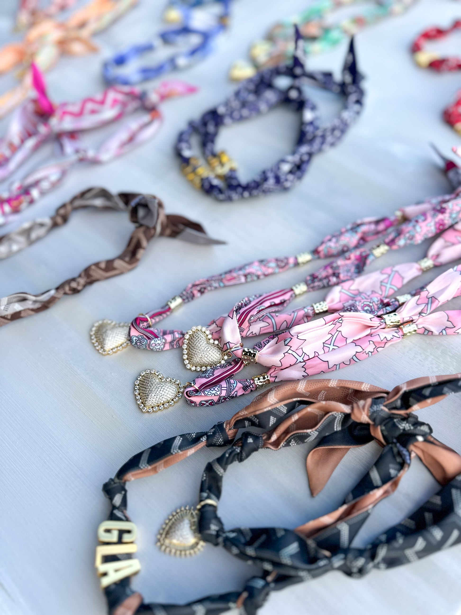 Adjustable satin scarf necklace with interchangeable 18k gold plated charm.