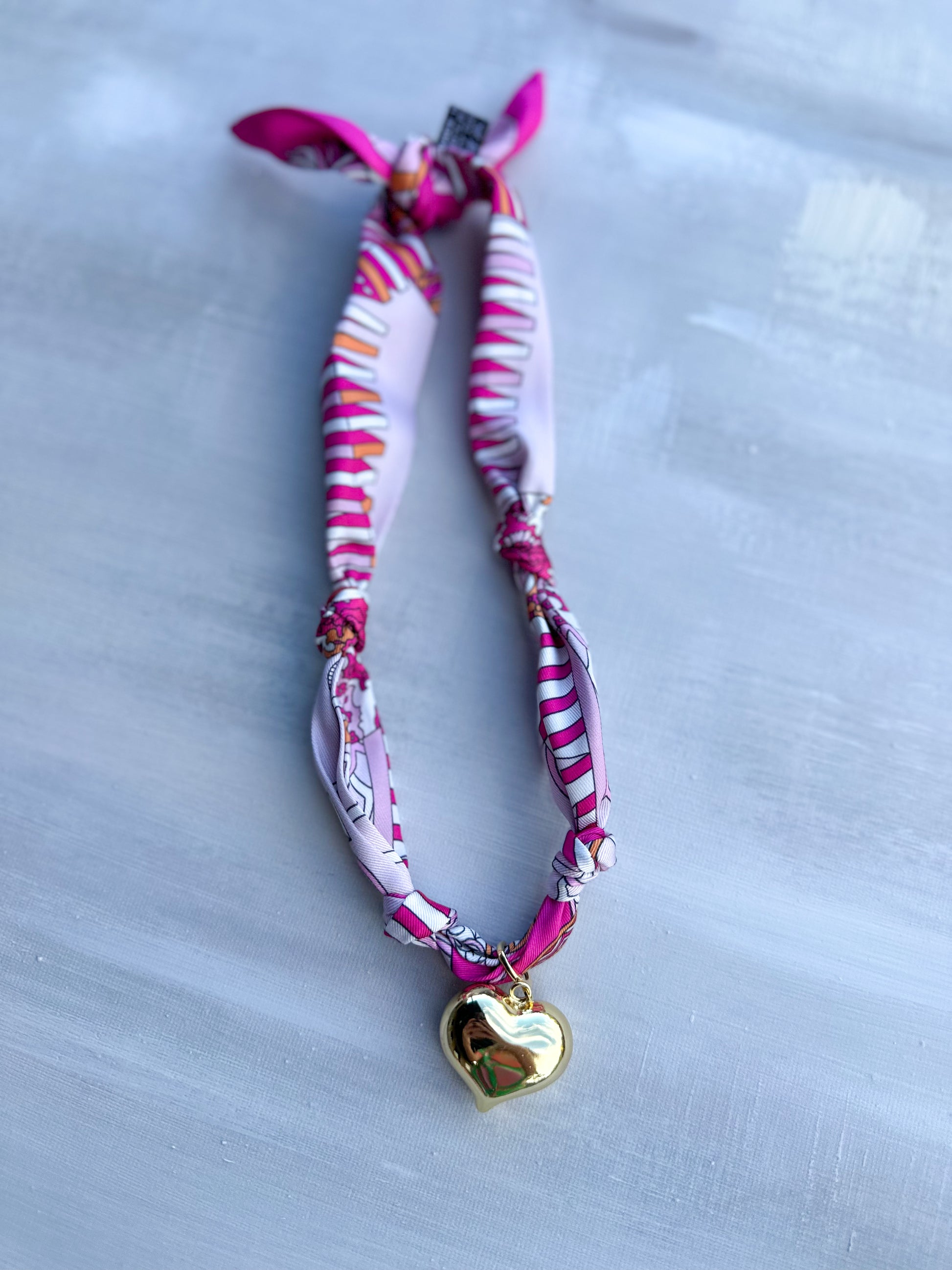 Adjustable satin scarf necklace with interchangeable 18k gold plated charm.