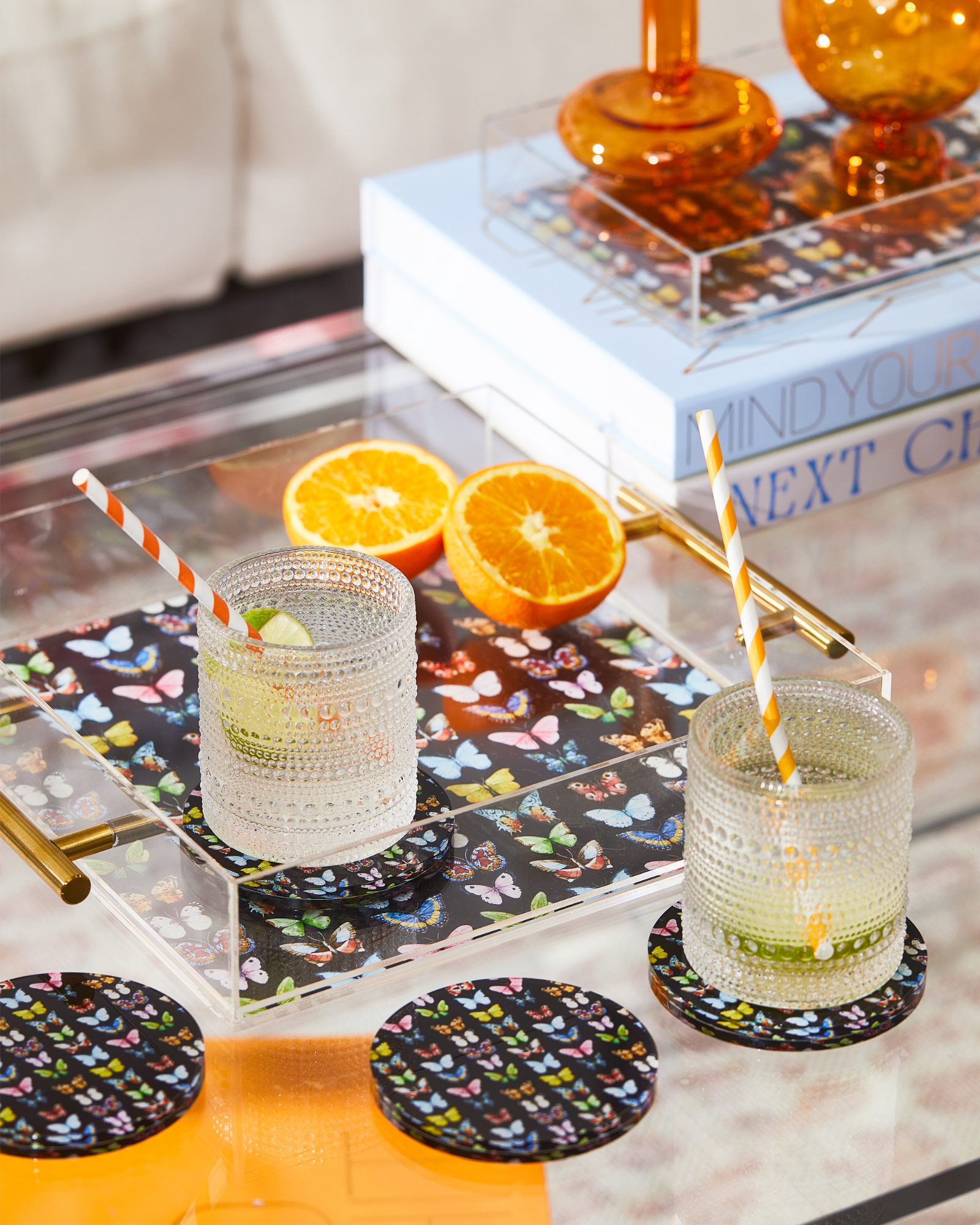 Add a splash of color and personality to your next get-together with these Monarch Coasters! These fun and funky handmade acrylic coasters feature beautiful monarch butterflies, and are sure to liven up any beverage - from coffee to cocktails! So get your drinks in flight with Monarch Coasters!