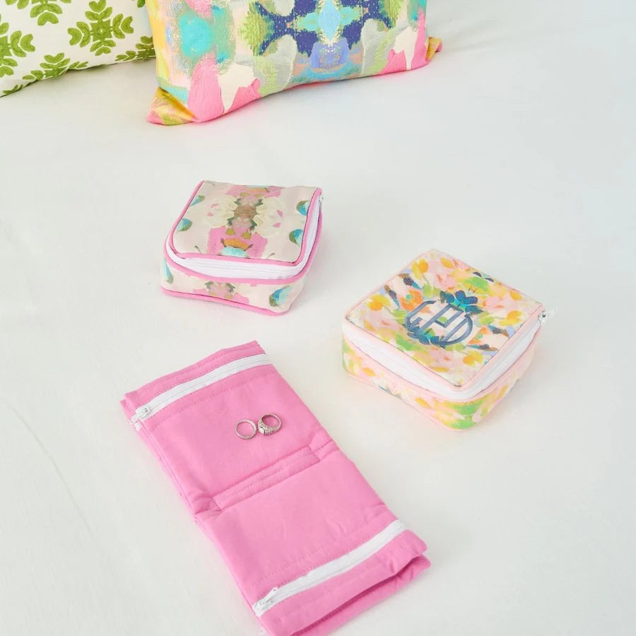 The Monet's Garden Pink Jewelry Case is the perfect travel companion for your favorite accessories and precious gems. Keep your jewelry safe, organized, and effortlessly chic with this stylish case, featuring a removable pouch set for smart storage and easy access.