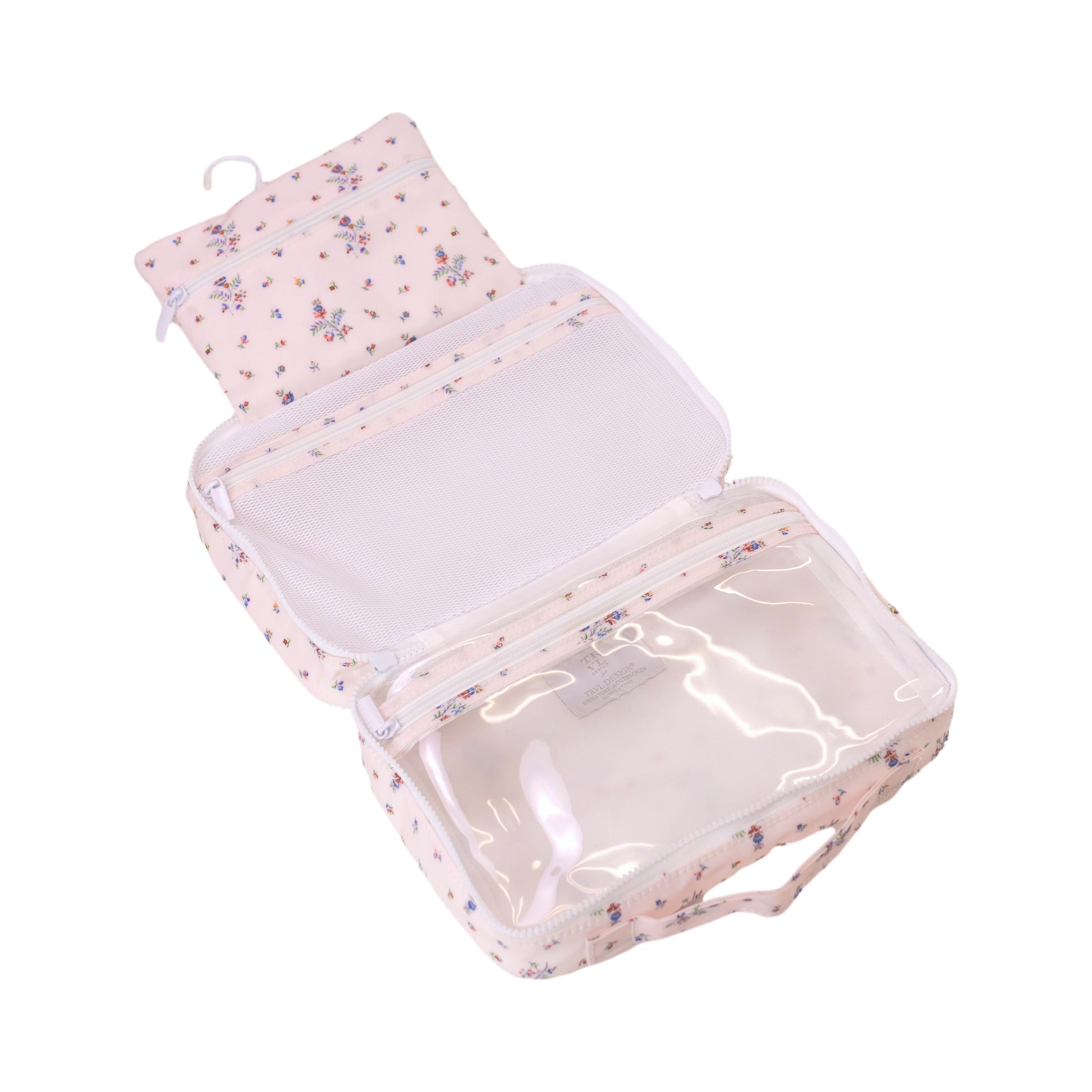 Use this fold up for makeup or toiletries, even baby and family TRVL! The inside pockets have roomy clear & mesh pockets and have an extra pouch for all the extras all to hang with the hook.