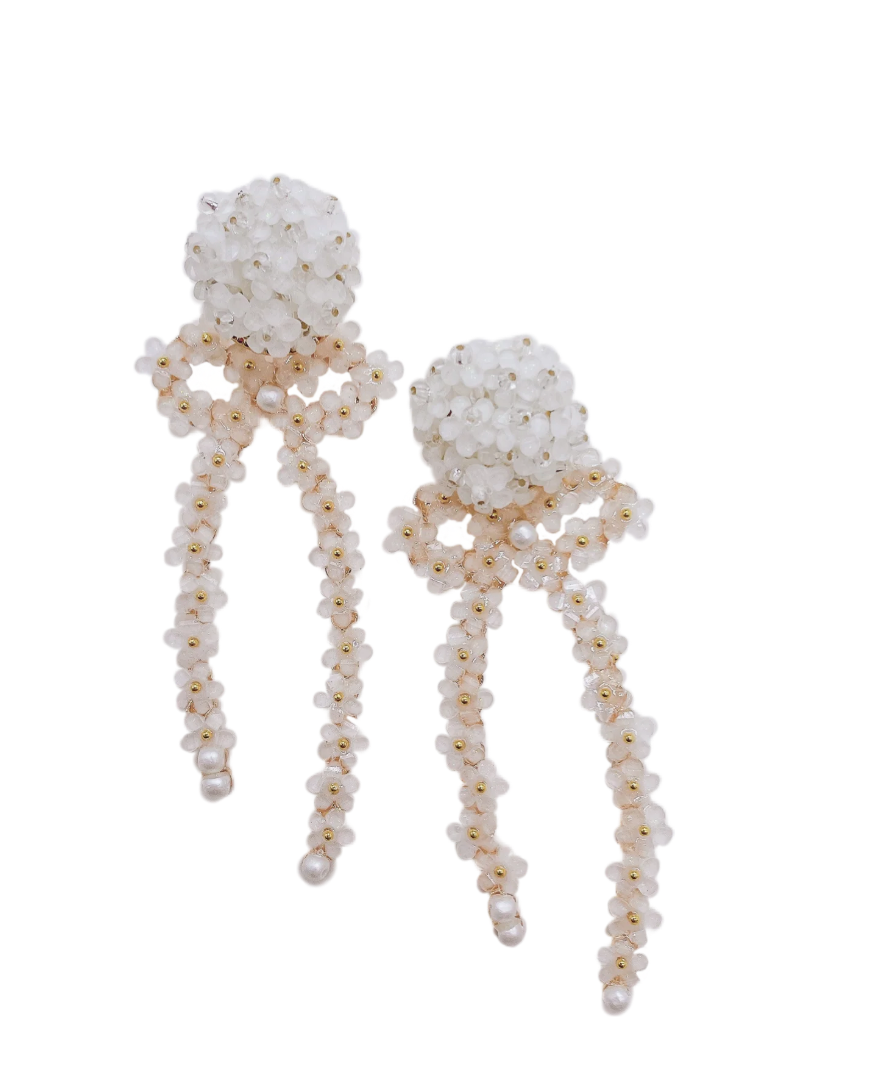 Delicate, dreamy, and utterly enchanting-these handcrafted floral beaded earrings are made to captivate. Featuring clusters of tiny pearl-like beads forming a soft bloom at the top, with cascading strands of miniature flowers, they bring a romantic, ethereal touch to any look. Perfect for brides, garden party, or adding charm to your outfit.